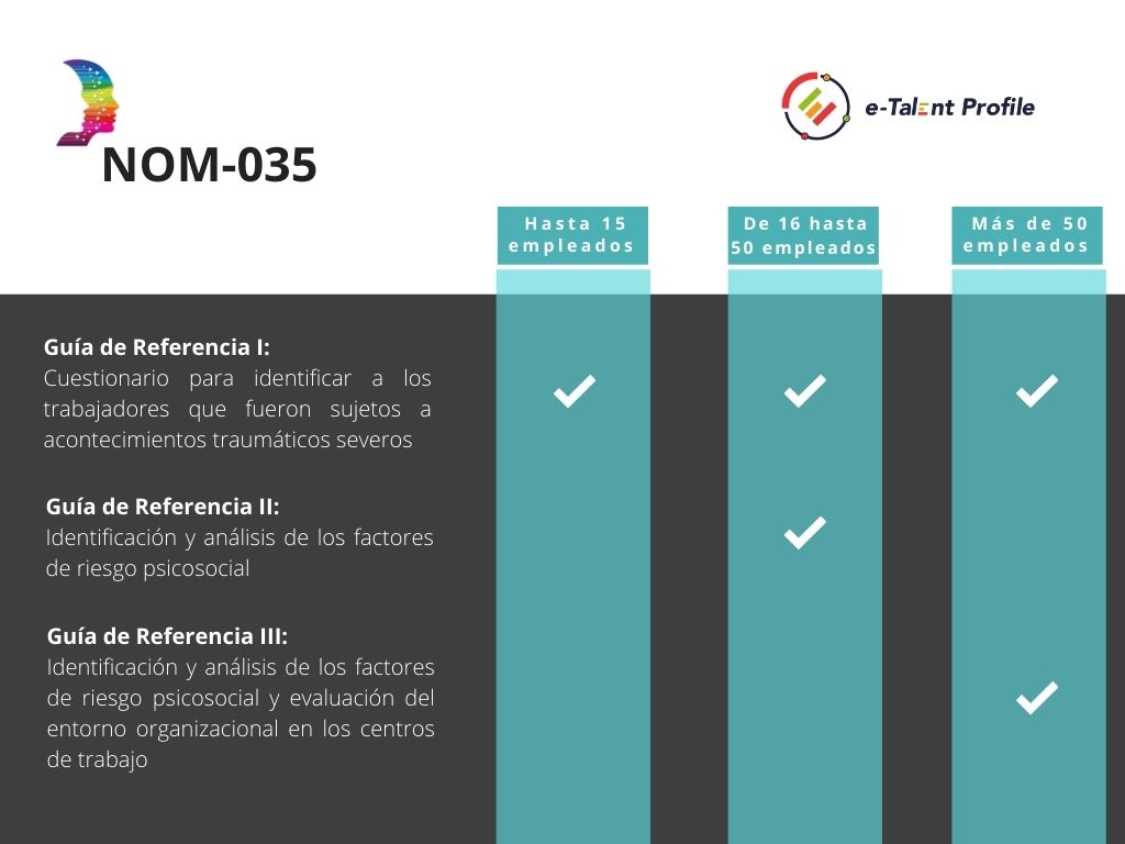Para implementar la NOM 035 y analizar los Factores de Riesgo Psicosociales lo primero es aplicar un instrumento de medición (Guía de Referencia). Esta tiene tres categorías: